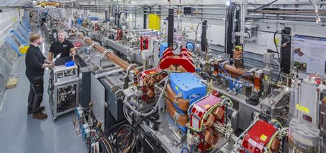 Electrons are generated in a radiofrequency (RF) gun and accelerated using three 4-metre-long, 3 gigahertz RF accelerating cavities to an energy of 250 million electron volts (MeV). A network of 77 electromagnets and 65 diagnostic devices are then used to focus and steer the beam through the 60-metre-long facility.