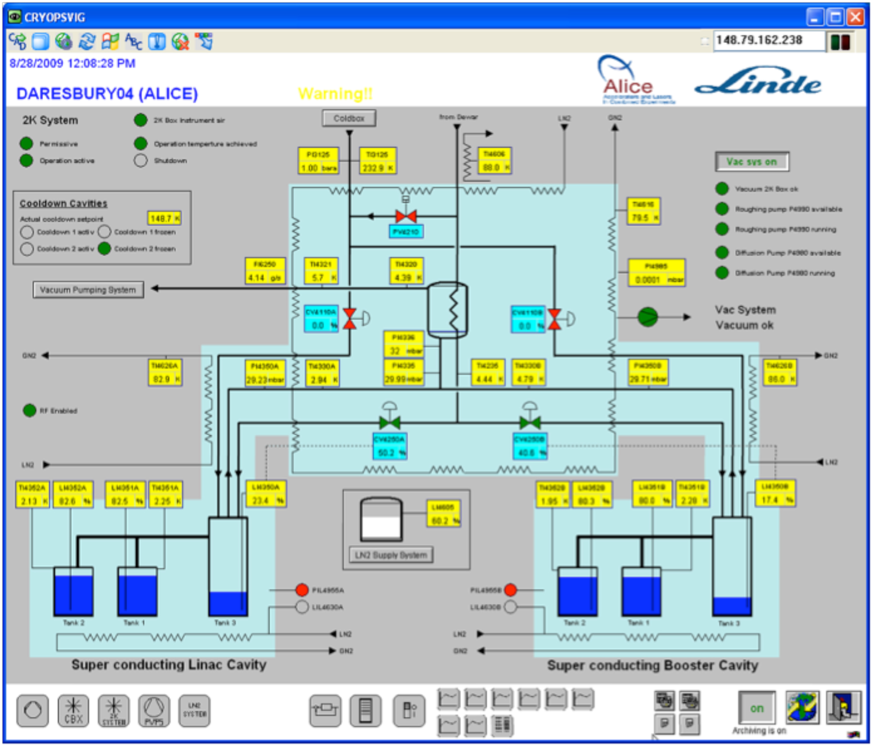 The system operates by using the 4K Coldbox to produce an inventory of liquid Helium which is held within the Liquid storage Dewar. The cavities are then cooled using a tightly controlled mix of warm and 'cold' gas from different sources within the 4K Coldbox to produce a cool down rate of 30K/h between 300K and 150K. At temperatures between 150K and 90K the cooldown rate must be increased to 180K/h, this high cooldown rate ensures that the RF cavities do not lose efficiency as a result of Q disease affecting the Niobium. On ALICE this is achieved by injecting liquid directly into the cavities, ensuring as fast a cooldown rate as possible is delivered, During this part of the "cooldown" the liquid feed valves are opened once the cavity temperature reach 175K. Below 90K cooldown rates are unlimited.