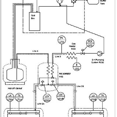 The ALICE cryogenics system cools and maintains the two superconducting RF modules at an operating temperature of 2 Kelvin. The system design is based on the combination of concepts from the ELBE and HoBiCaT cryogenic systems and has the capacity to operate with a dynamic (RF induced) heat load of 118W at 2K. The system consists of a Helium compression system, 4K liquefier, liquid Helium storage Dewar, 2K Coldbox containing a 2K counter flow heat exchanger and 2 ambient temperature Vacuum pumping systems. A system diagram is shown below.